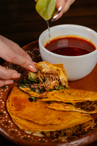 Chorreada de maíz azul, asiento de puerco y queso menonita acompañada de deliciosa birria de la casa, con aguacate y coronado con cebolla morada, cilantro y cebollín
